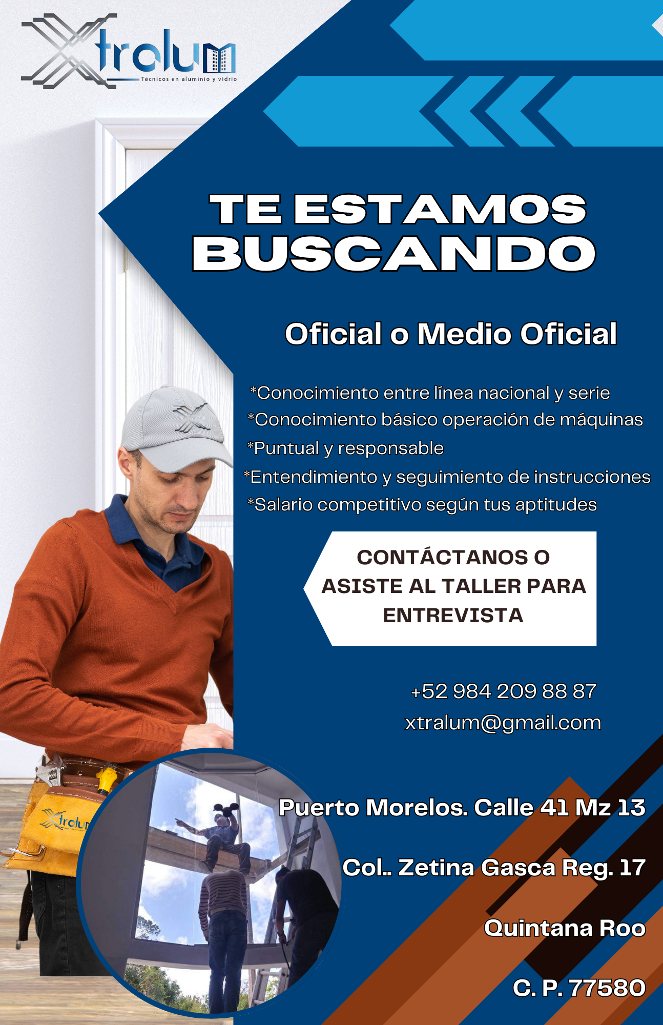 Tienes experiencia en el oficio de aluminio y vidrio, sabes usar herramientas de corte, ensamblar e instalar. Acómpañanos como Oficial o Medio Oficial en nuestro taller de producción, junto a un equipo y ambiente de gran camaradería. ¡Te esperamos!